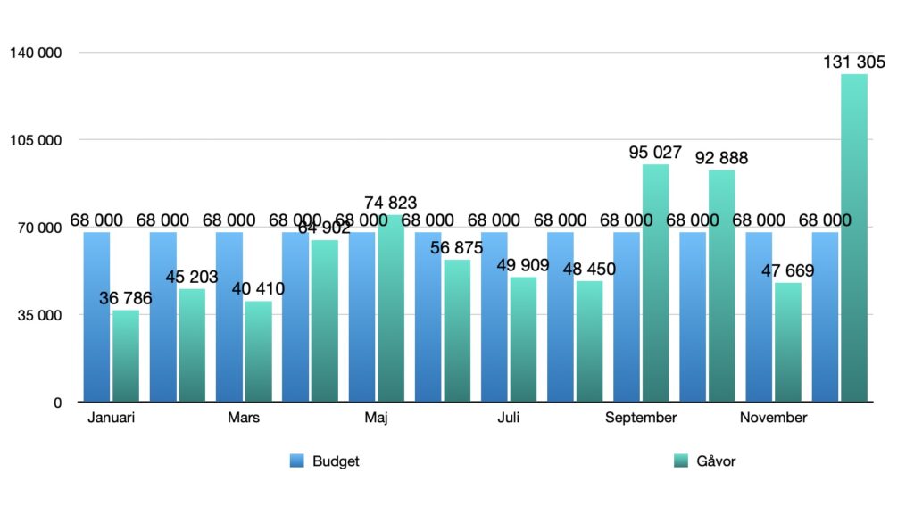 Totalt för 2025 hamnade insamlade gåvor 31 753 kr efter budget.